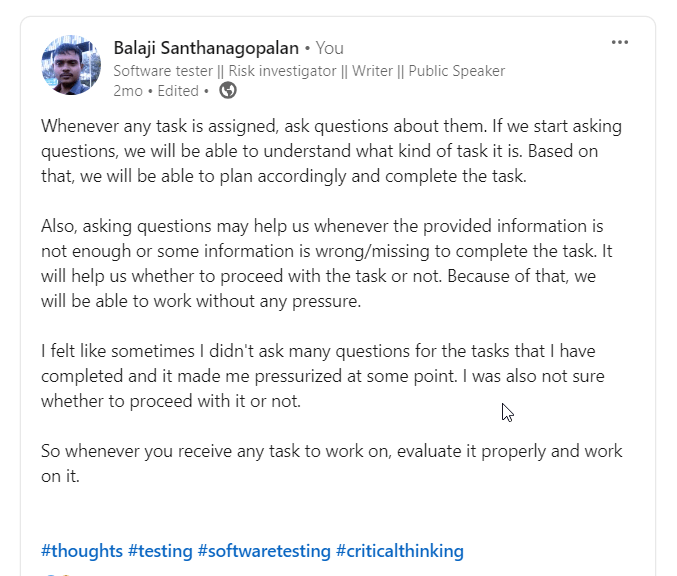 This is the major starting point for practising critical thinking. Questioning helps us to analyze the tasks or requirements that we receive so that we can work on those. Especially, if we have doubts about performing that task, we need to ask questions to get things clear for us. Here is the LinkedIn post that I posted on how asking questions will help us plan our work