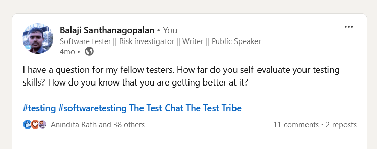 I have received a lot of comments for this post and learned many new things that can be useful for self-evaluating my testing work. I used to self-evaluate myself a lot to see how I was progressing in both my professional and personal lives. Depending upon that, I decided to take action so that I did not deviate from the duty that I needed to perform. Also, by practising this, I was able to handle my emotions somewhat better at the personal level to avoid some conflict situations.
