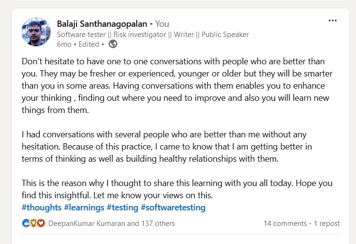 Even, I started posting questions about software testing on LinkedIn which I have clubbed and published in a single blog: “Some probing questions related to Software testing“. I did this activity to evaluate my understanding of software testing and to learn new things from them