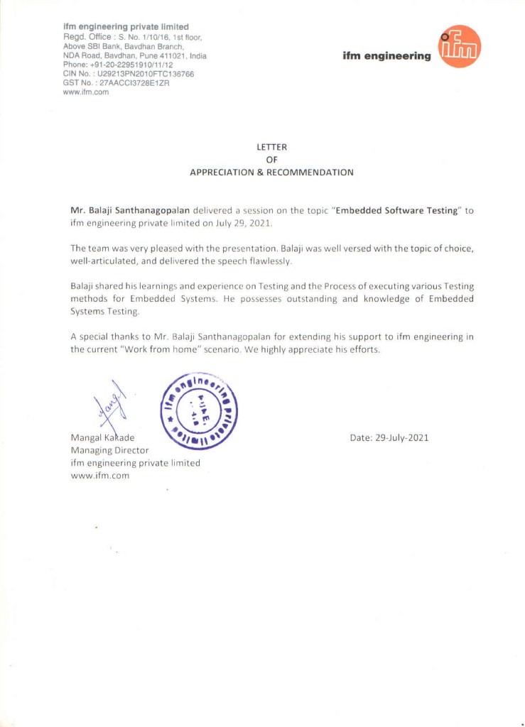 In 2021, I got an opportunity from my friend Rahul Parwal to deliver a webinar for his company IFM Engineering Private Limited on the topic “Embedded Software Testing” to share my knowledge about Embedded Systems Software Testing. It was a wonderful experience delivering a webinar on this topic as there was not much content available related to Embedded Systems Software Testing. Based on this, I did my first conference talk in 2022.